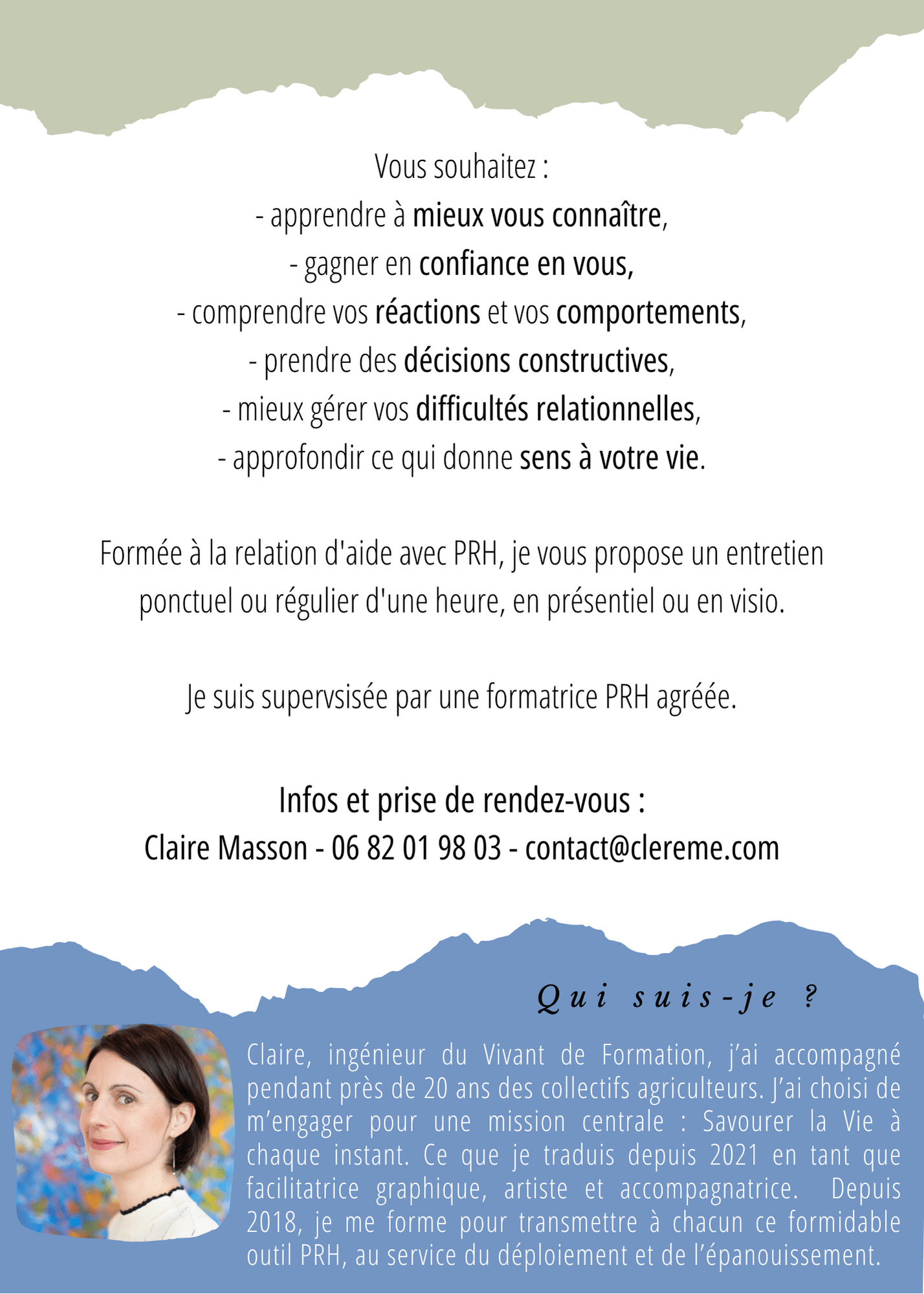 Formée à la relation d’aide avec PRH, je vous propose un entretien ponctuel ou régulier d’une heure, en présentiel ou en visio. Je suis supervisée par une formatrice PRH agréée.